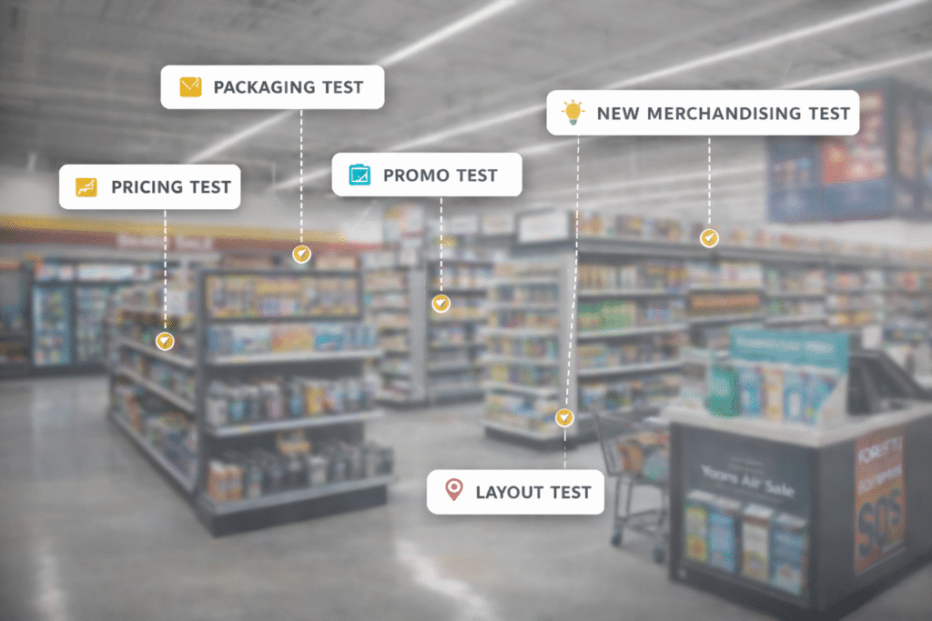 Test planogram changes, endcaps, and signage with statistically sound control groups across regions.